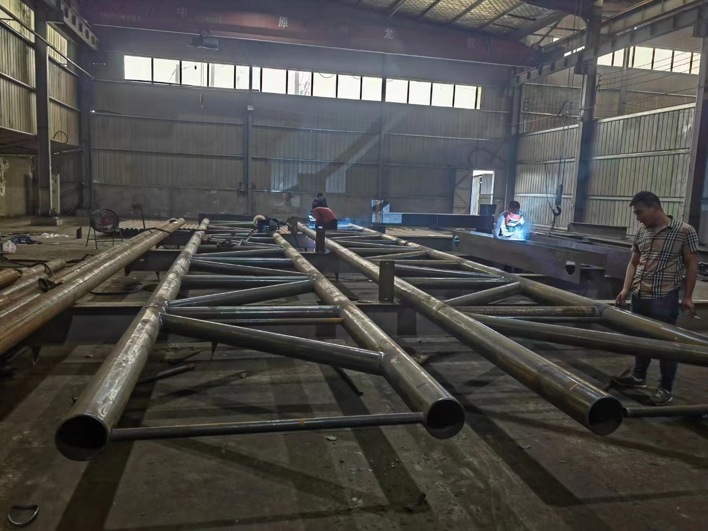 3.焊接后检查管桁架的整体尺寸,修复缺陷并打磨。涂漆后标记编号,标出安装定位线,并准备安装。